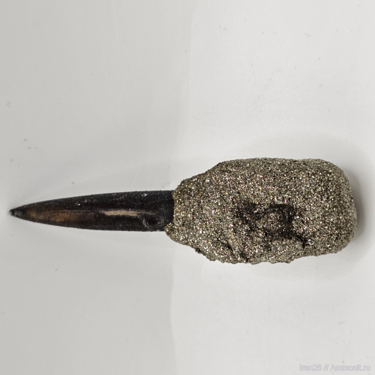 Очередная находка белемнита Neohibolites sp. в пирите. Найден в альбских глинах Карачаево-Черкесии. Размер 67*22 мм. Находка 2025 года.