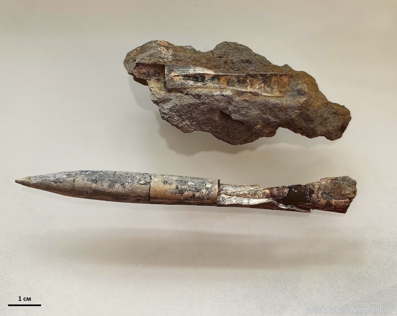 Белемнит с сохранившимся фрагмоконом из берриасских отложений окрестностей с.Куйбышево (см. Фото). Окаменелость была немного раздавлена в породе, и в трещинах успели отложиться корочки прозрачного минерала. Извлекли находку частями. Всё склеивать не стали, ввиду того, что самое интересное останется внутри.