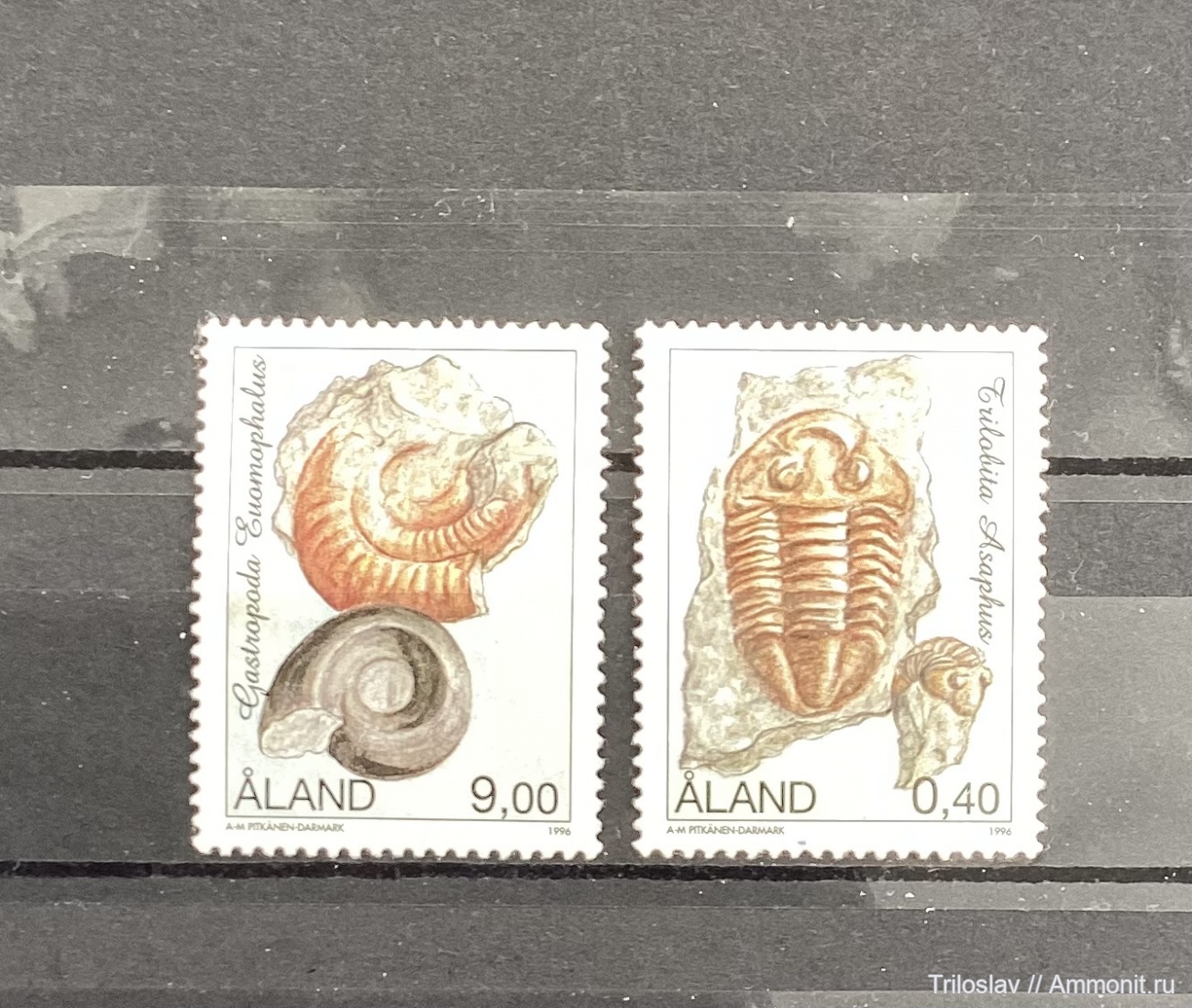 Марки Аландских островов, это автономия в составе Финляндии. Там есть выходы палеозойских пород, и там были найдены изображенные на марках образцы.