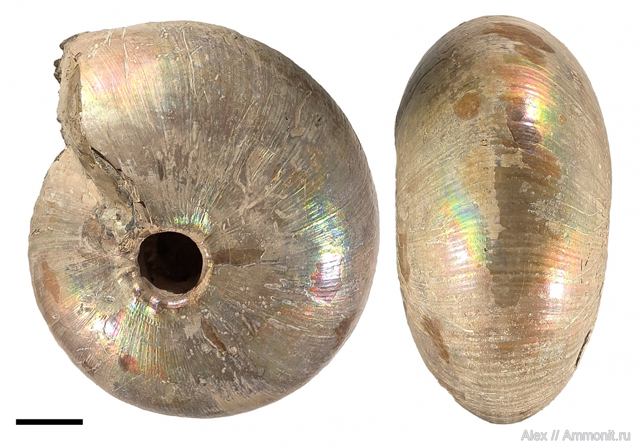 Этот аммонит был найден в нижней части слоя черных глин по соседству с Cadochamoussetia surensis - 2019. Его перламутр очень хорошо сохранился благодаря тому, что аммонит был выкопан из коренника и не подвергался воздействию грунтовых вод или атмосферных осадков. Масштабный отрезок 2 см.