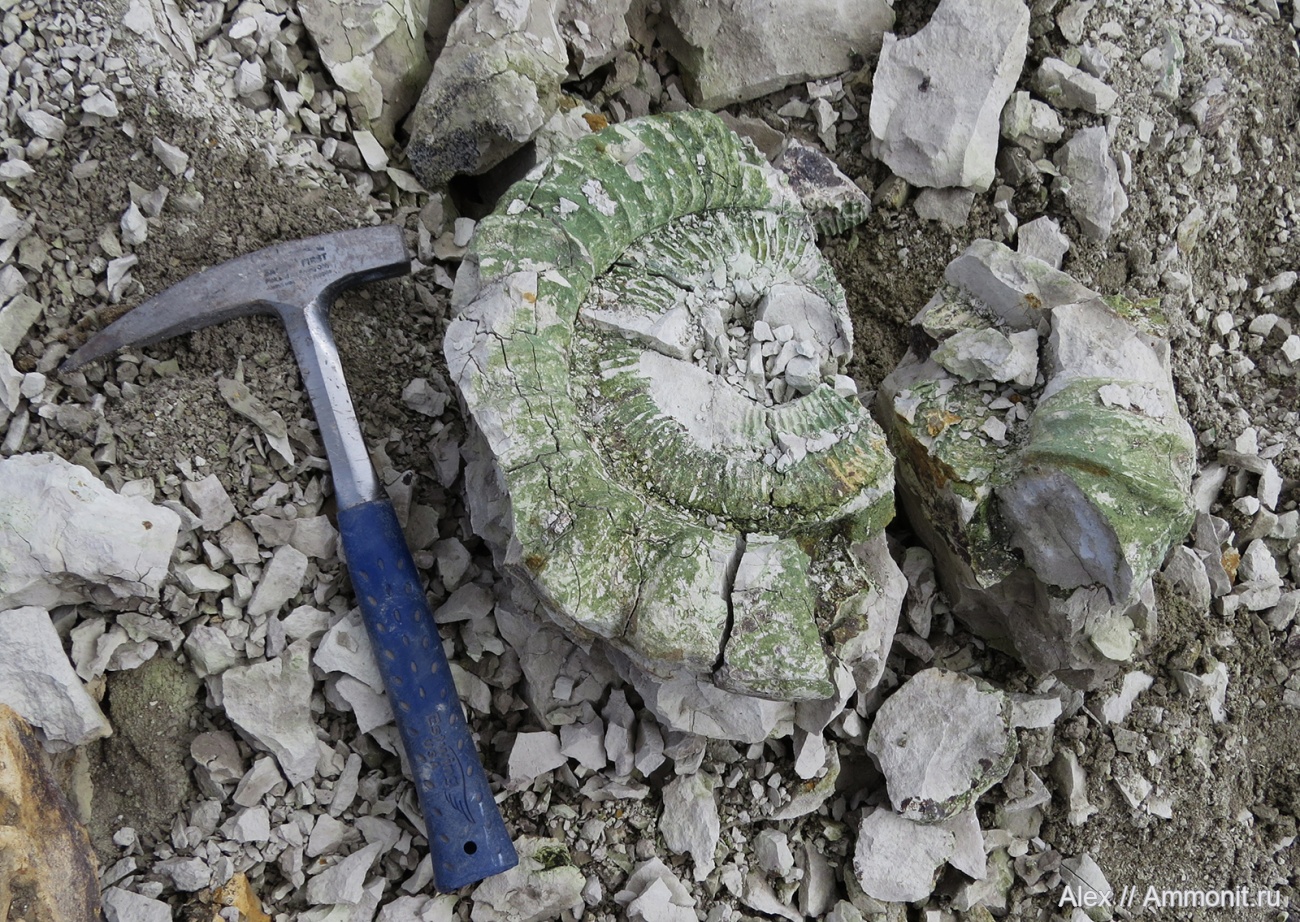 В карьере Починки выходят слои не только келловейского, но и оксфордского возраста. Прямо поверх среднекелловейской зоны Coronatum лежит слой светлого мергеля, в котором изредка встречаются вот такие гигантские ядра макроконхов перисфинктид. К сожалению, все они практически не извлекаемые, так как уже в слое разбиты трещинами на множество кусков.