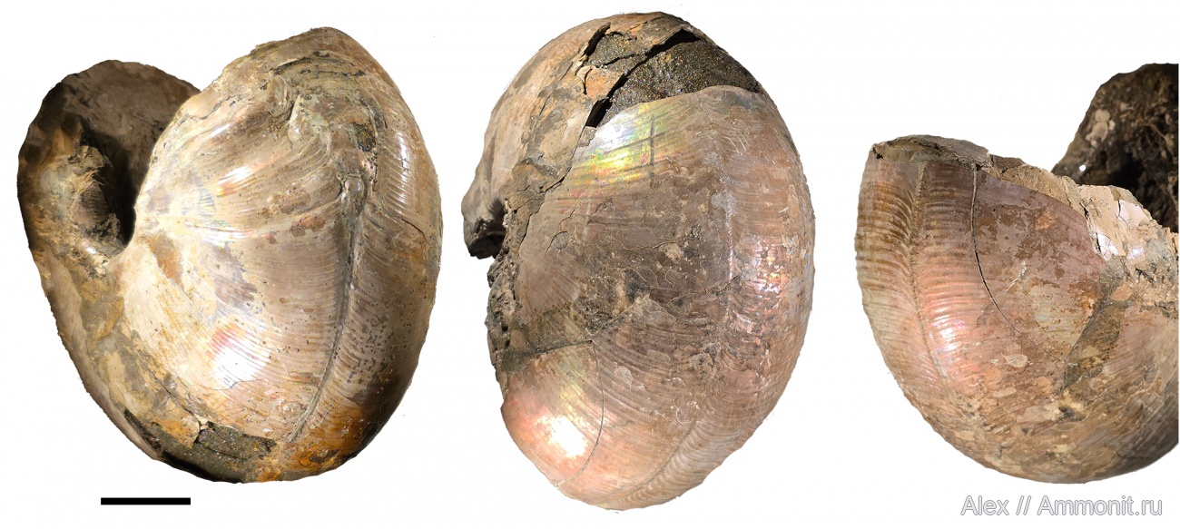 От этого аммонита сохранилась только жилая камера, фрагмокон рассыпался. Однако, эта жилая камера очень интересная в палеоэкологическом плане: ее "украшает" длинный шрам - след атаки какого-то хищника. Нападающий не только обломал край временного устья молодого аммонита, но и сильно задел край мантии, травма которого при дальнейшем росте раковины привела к формированию шрама. Длина масштабного отрезка 2 см.