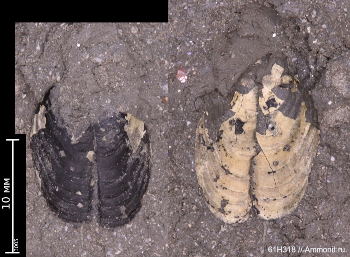Михайловцемент, 0.5 м выше нижней границы серой глины (слои с Erymnoceras'ами, Coronatum.Grossouvrei). И ещё один из вышележащих слоёв среднего келловея (не выше 1.5 м).