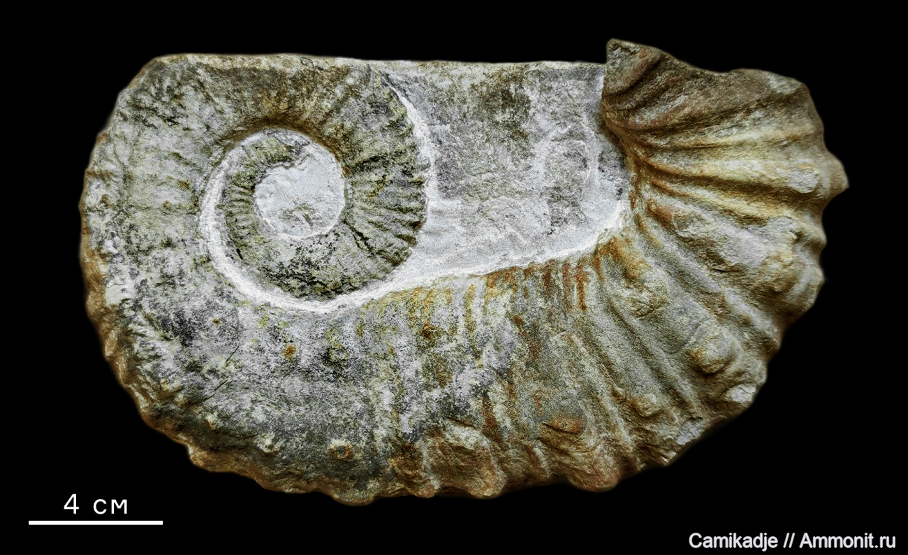 Из этого разреза описаны Pseudocrioceras waagenoides и Ancyloceras vandenheckii, определяльщик из меня тот еще, первый наиболее похож. Хотя другие найденные Pseudocrioceras из этого и соседних разрезов сильно крупнее, а этот в сравнении совсем малютка. Фото с вентра нет, его довольно сильно расплющило.