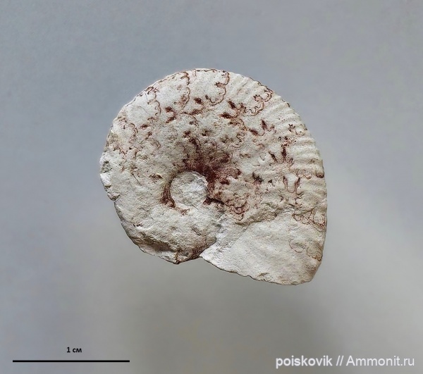 Похоже - это фрагмокон Hoploscaphites. А, судя по наличию финального сближения крайних лопастных линий, это уже достаточно взрослая особь. | ||||||