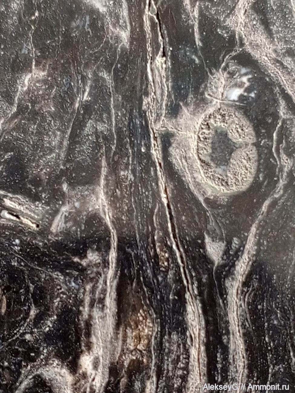 Фрагмент какого-то ископаемого растения с реки Нижняя Тунгуска. Предполагаю, что это какой-то древовидный папоротник. Возраст неизвестен, есть в этом районе как пермские отложения, так и мезозойские. На этом фото - поперечный срез, на остальных - поверхность окружности стволика. Рельефно выделяются какие-то или дихотомически ветвящиеся внутренние стебли (типа как у Темпскии, стебли внутри ложного стволика) или "каналы" какие-то проводящие, не знаю.