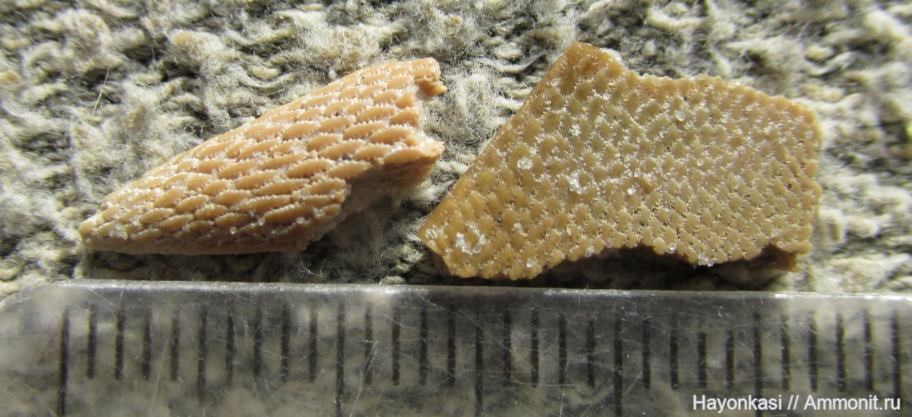Фрагменты двух бранхиальных пластин Псаммостеид (предположительно Psammosteus sp.).