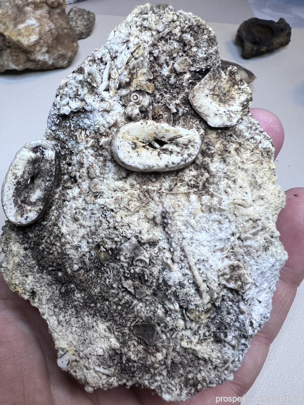 Красивый конгломерат! Вы и сами в целом верно определили. В основном иглокожие, фрагменты ежей и лилий. Вроде бы местами видны кусочки брахиопод, ругоз и мшанок. Роды и виды определять я не возьмусь, трудоемкое и неблагодарное занятие по таким фрагментам. Если интересно, попробуйте сравнить с чужими снимками по Подольску, Домодедово, Акатьевскому карьеру. | ||||||