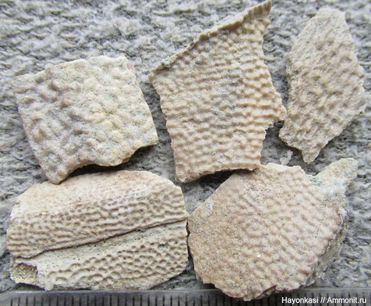 Самая частая находка в Писковичах - мелкие тонкие обломки панцирей плакодерм (отряд Antiarchi). Редко их толщина превышает 2 мм, часто не доходит и до 1 мм.