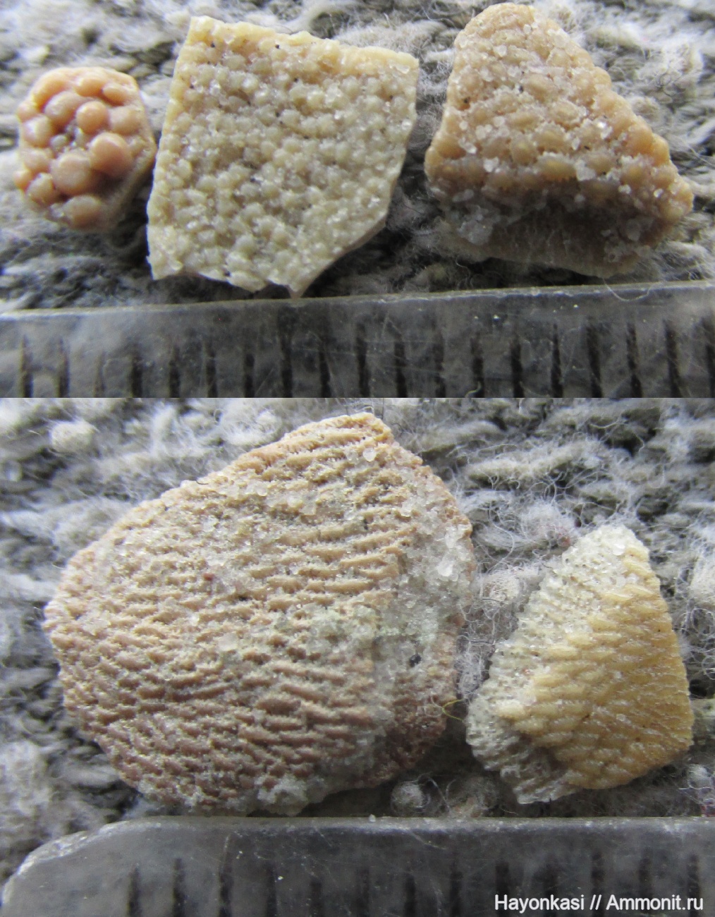 Чешуи бесчелюстных Псаммостеид. Сверху слева - предположительно тессера лопастепёрой рыбы Laccognathus.