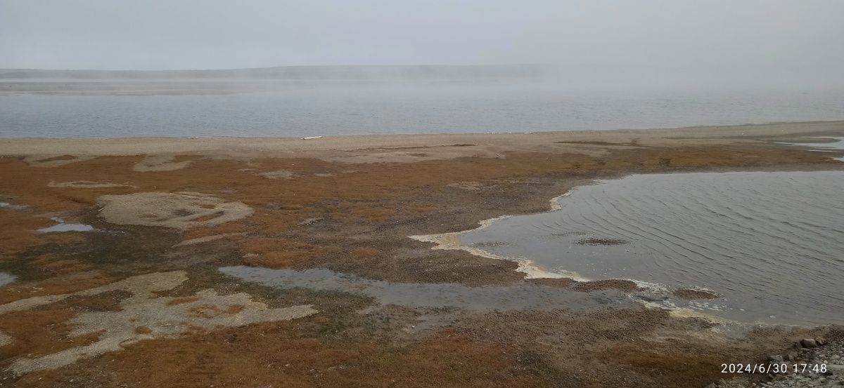Вид на лагуну Пшеницына Фото, Фото. С юга в нее впадает одноименная река, русло которой проходит по обнажениям нижнего D1ps и среднего девона