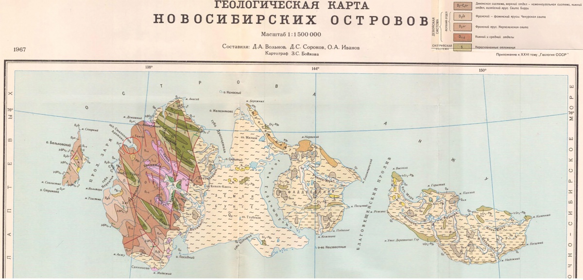 Фрагмент геологической карты S-53-IV,V,VI (о. Бельковский), М1:200000, 1982 с расположением карьеров (ломаная красная линия) и местом поисков (синяя звездочка). На косе, где звездочка написано, что это неоген, но это время образования косы, а сложена она наносами из гальки с близ лежащих обнажений. Основные находки здесь по частоте встречаемости остракоды, табуляты, брахиоподы, двустворки, пара находок трилобитов, пара образцов с ортоцерасами и единичная находка чешуи рыбы. С карьеров завезли много камня (это верхний силур - S2es – лудловский-пржидольский ярусы, эсэлэхская свита), он почти пустой, была пара находок за 2,5 месяца двустворка и не извлекаемый табулят. Из этого я делаю вывод, что остальные находки с гальки это нижний девон, расположенный рядом, принесенный льдами морем и с русла р. Пшеницына. Но я могу ошибаться, карьеры глубоко не копали, а снимали верхний слой породы, это может быть один или несколько пустых слоев. Может быть по находкам можно будет определить возраст.
