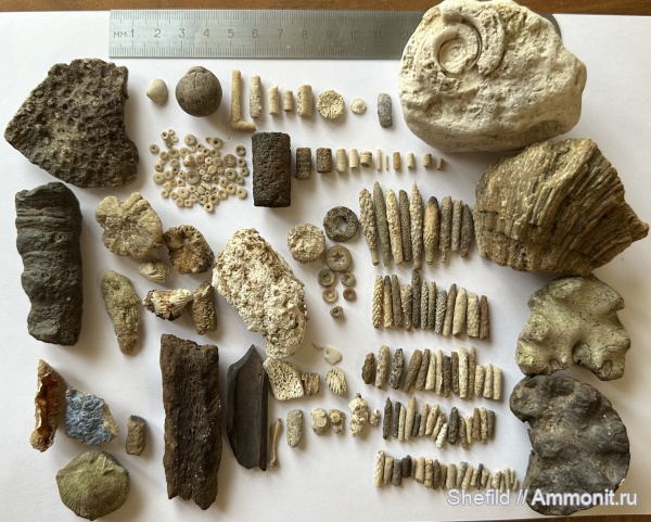 Ключевые слова (тэги): аммониты, брахиоподы, гастроподы, морские ежи, морские лилии, карбон, юра, мшанки, кораллы, губки, двустворчатые моллюски, Archaeocidaris, Lagarodus, Russiella, Московская область, кости, зубы рыб, р.Бунчиха