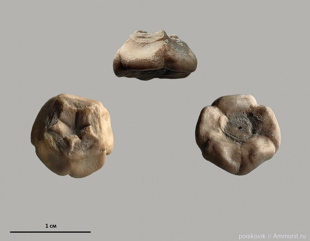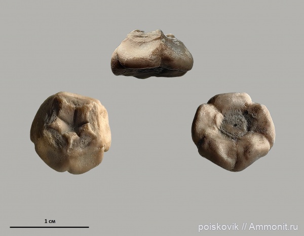 Чашечка морской лилии Sclerocrinus (в 3-х проекциях) диаметром 10 мм. Найдена в оксфордских глинах в окрестностях пляжа Инжир.
