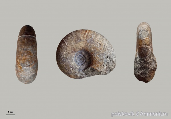 Аммонит с сохранившейся раковиной диаметром 7,3 см (в 3-х проекциях) из альбского эрратического валуна Балаклавы.