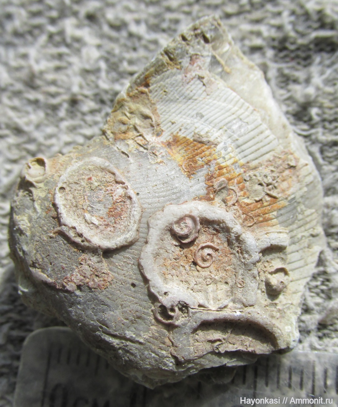 Половина выпуклой створки брахиоподы Ladogia meyendorfii, плотно заселённая обрастателями - брахиоподами Irboskites fixatus и микроконхидами. Внизу Ирбоскит частично "заполз" на раковинку микроконхиды, а новые микроконхиды поселились уже на его останках.