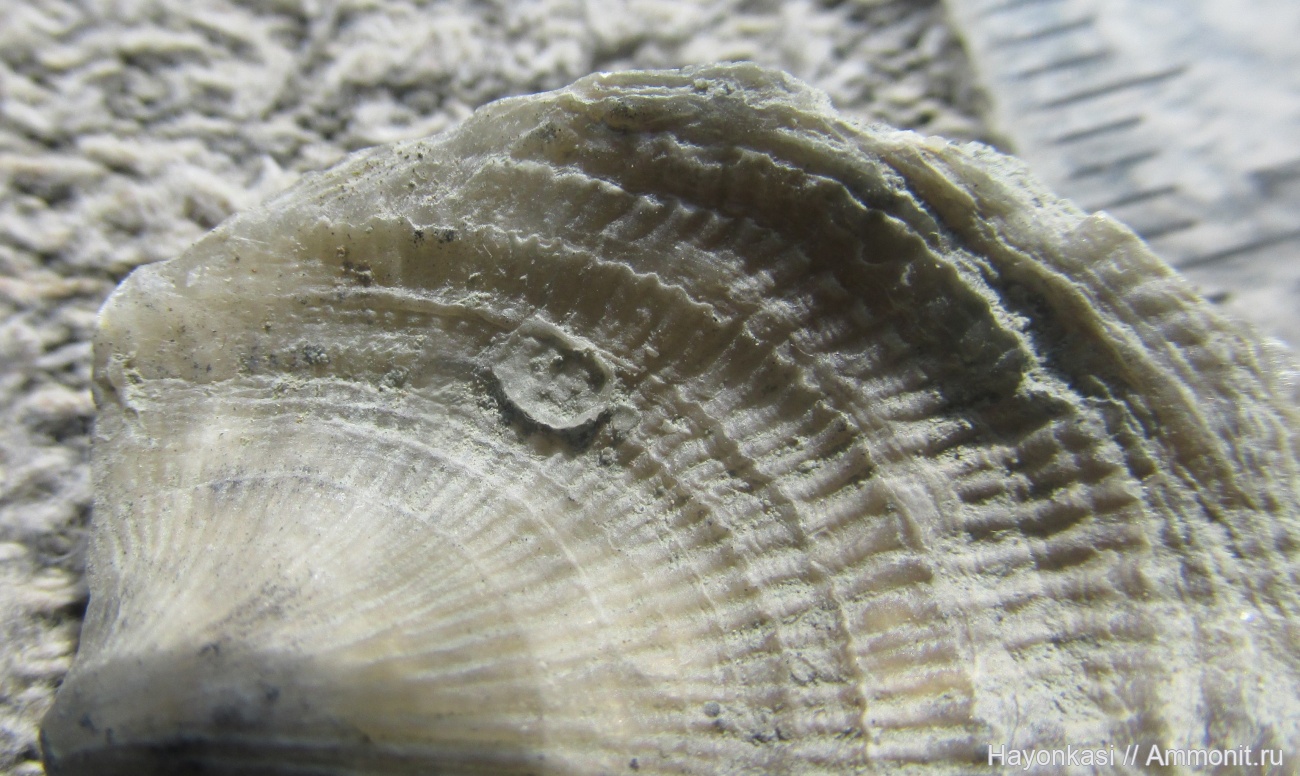 Очень маленький Irboskites fixatus на вогнутой створке Atrypida. Непросто ему было держаться на такой ребристой поверхности.