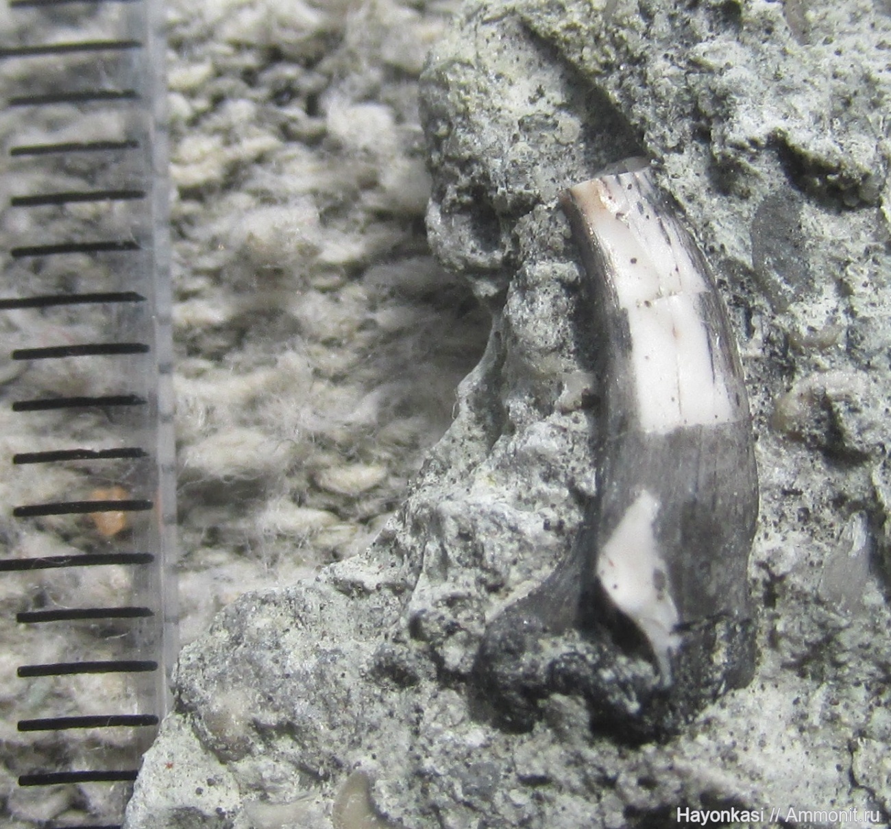 Повреждённый зуб лопастепёрой рыбы, предположительно Onychodontiformes.