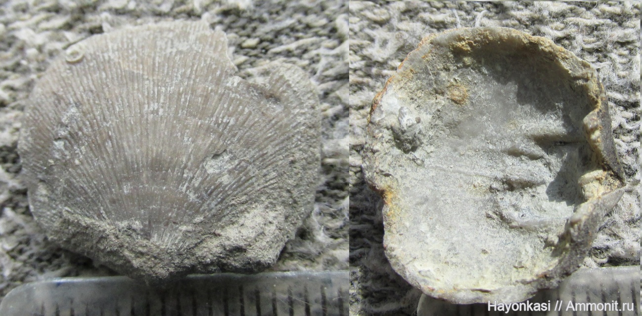 Ещё одна брахиопода из д.Родина - Schizophoria sp. На точке встречается редко, в виде отдельных створок.
