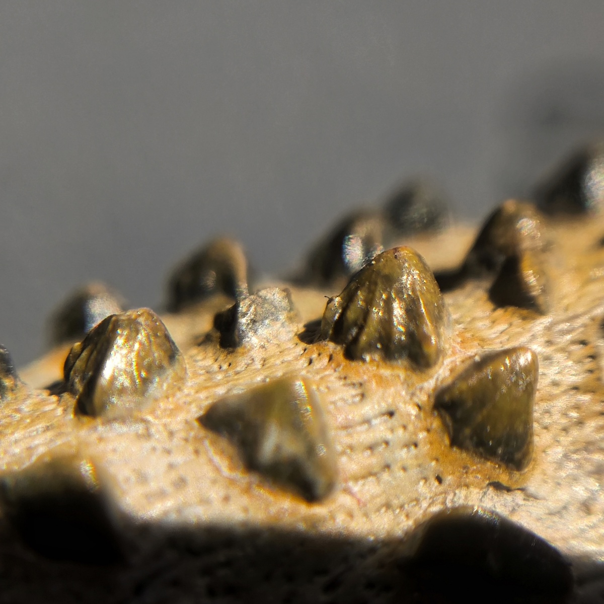 Увы, по такому маленькому кусочку (Вы обратили внимание, он окатан с боков) сказать можно только, что это либо часть шипа, судя по выпуклой поверхности, либо части панциря.