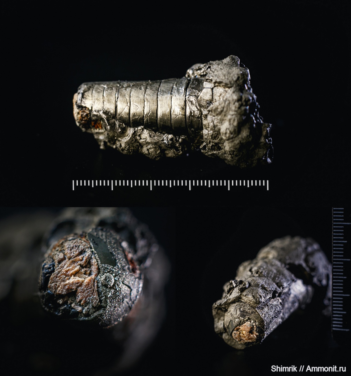 Снова борщевский пирит, на этот раз фрагмент прямораковинного моллюска. Пирит, на мой взгляд, в отличие от лимонита, чаще позволяет увидеть детали, например у этого образца виден сифон. Образец склеен из двух частей, так вот внутри этот сифон тоже виден, то есть видимо сохранился насквозь.