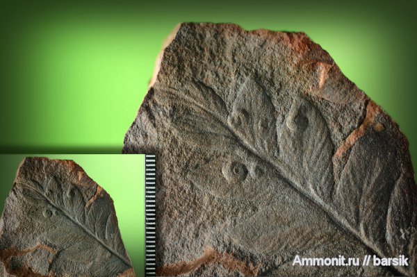 На сколе открылась ветка Mariopteris(?) и какие то спиралевидные образования. Похожи на мелкие раковины. К сожалению. отпечаток немного разрушен и не имеет мелких деталей.