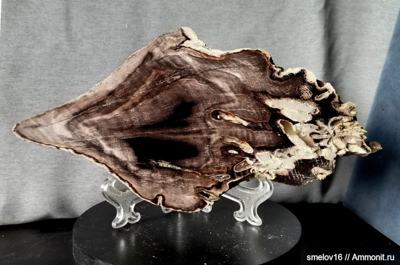 К-197.3 Полированная пластина окаменелого дерева со следами жизнедеятельности моллюсков Teredo. Размер (21-11-1,8см) Палеоген . Берег реки Волги. Волгоградская обл.