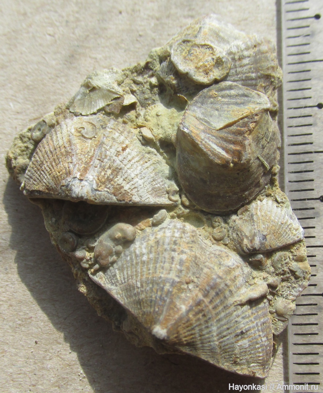 Фрагмент отложений прибойной зоны - створки Lamellispirifer muralis. Интересен "густонаселённостьью" - почти каждая раковина несёт на себе обрастателя. На створке брахиоподы в нижней части фото - раковина червя Cornulites, на створке слева - Microconchida. В верхней части фото - створка Lamellispirifer muralis с приросшим к ней Irboskites fixatus. Ещё один Irboskites fixatus (крупная чашеобразная нижняя створка) лежит справа; он перевёрнут, но сохранился обломок раковины-субстрата (видимо, Ripidiorhynchus sp.). И на этом обломке, уже на опрокинутом Irboskites, поселился второй Irboskites, он сохранился хуже, но ещё заметен.