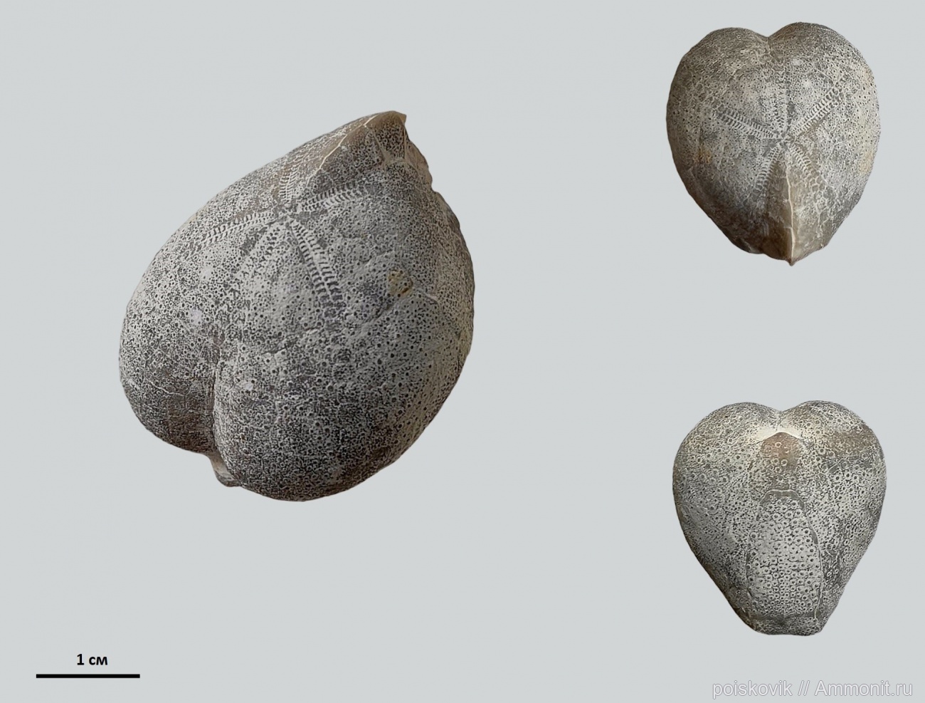 Необычный неправильный морской еж Micraster (в 3-х проекциях) из верхне-меловых пород Белогорского района. Просим помощи в определении.