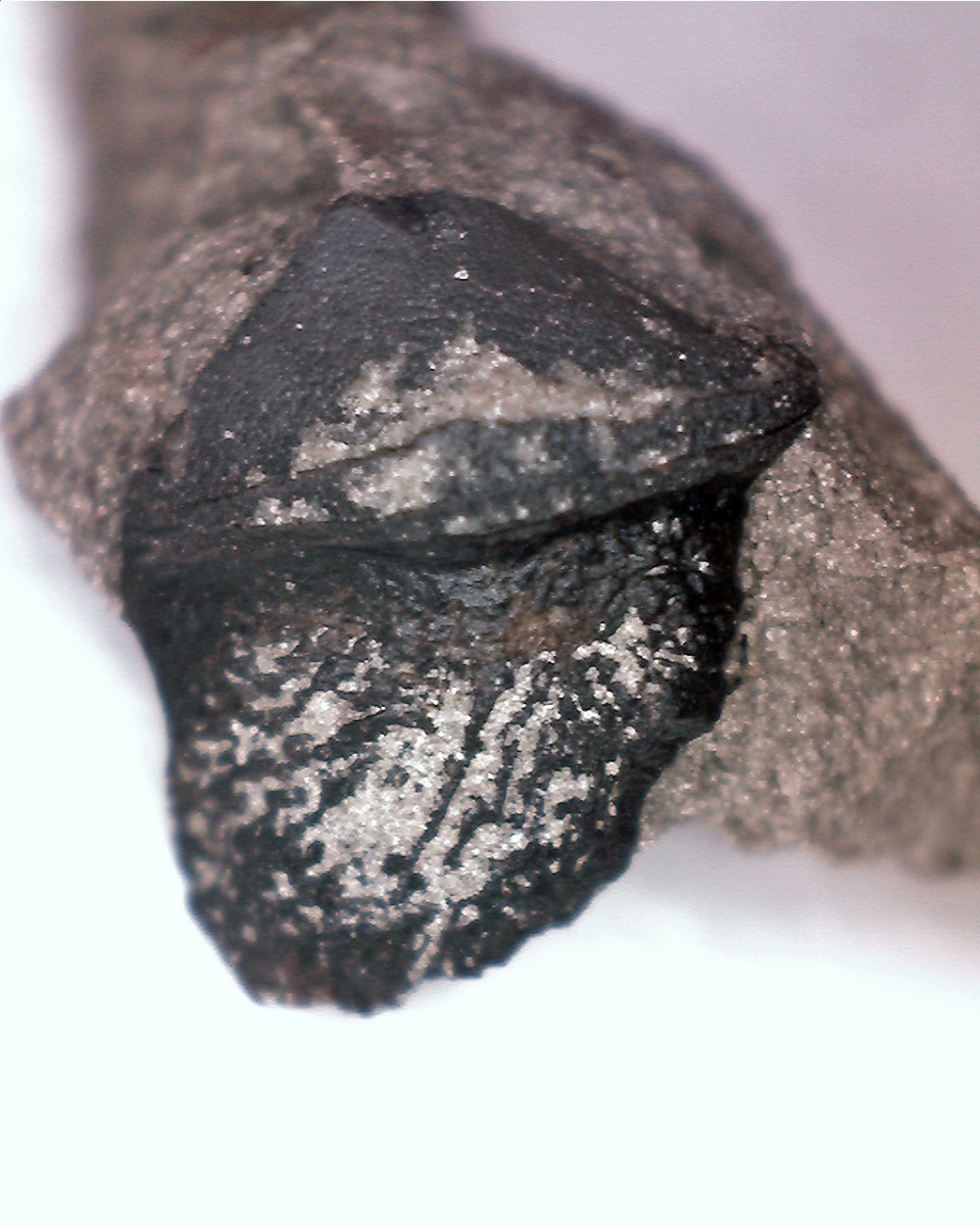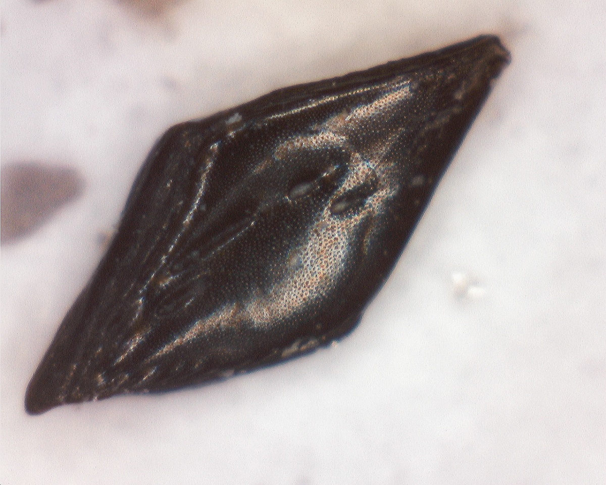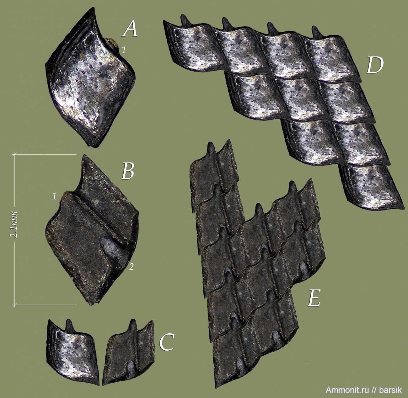 Этот объект сначала не привлек внимания, но потом, при большем увеличении обнаружился обломок шипа (1) и ярко выраженный паз сочленения (2) A и B. Паз сохранился идеально, а шип просто дорисовал, чуть уменьшив форму паза. На фото С - это немного отреставрированные проекции оригинала. Добавлен шип и чуть раскрошившаяся вершина ромба. Ну а затем попробовал уложить эту "черепицу" на тело рыбы. "Е" - взгляд изнутри, "D" - наружное покрытие рыбы. Продольное сопряжение - уверен "шип в паз", а вот поперечное - может и угадал крепление по ступенчатому ребру, а может все было более плотно. Сам образец такого же темно-серого цвета с графитовым отсветом.