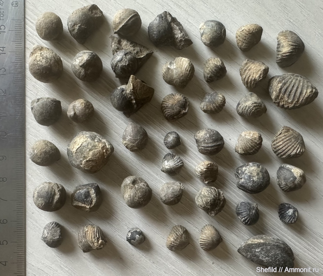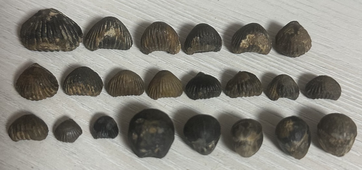 Небольшие брахиоподы (некоторые на породе) и одна продолговатая двустворка (справа внизу) из находок 30.06.25г. Судак