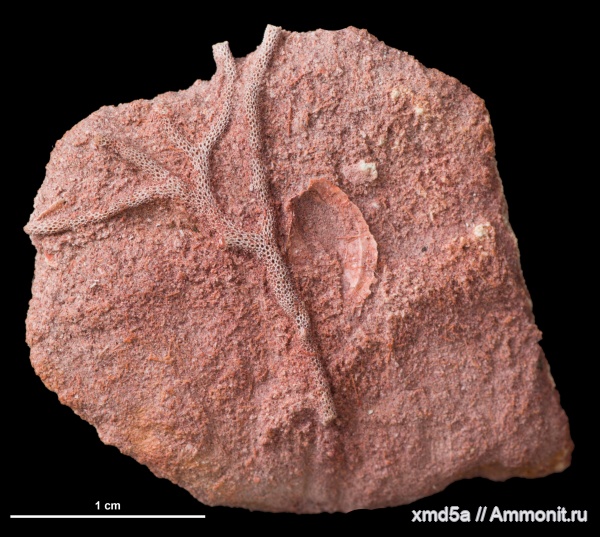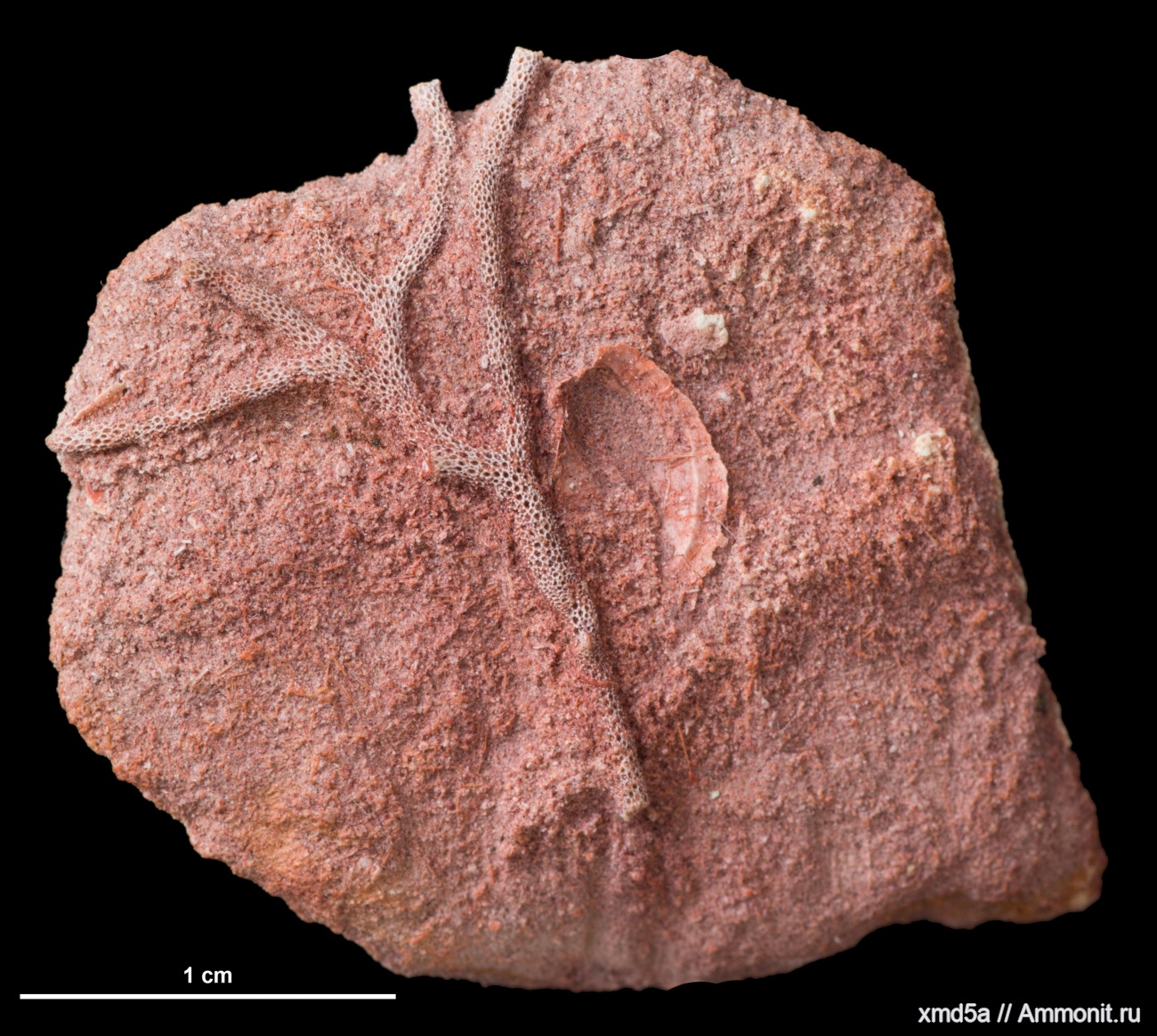 Еще одна мшанка. Эта фауна захоронена в красной слоистой глине в непрочных фиолетово-красных мергелевых конкрециях. Селивановский район, казанский ярус.