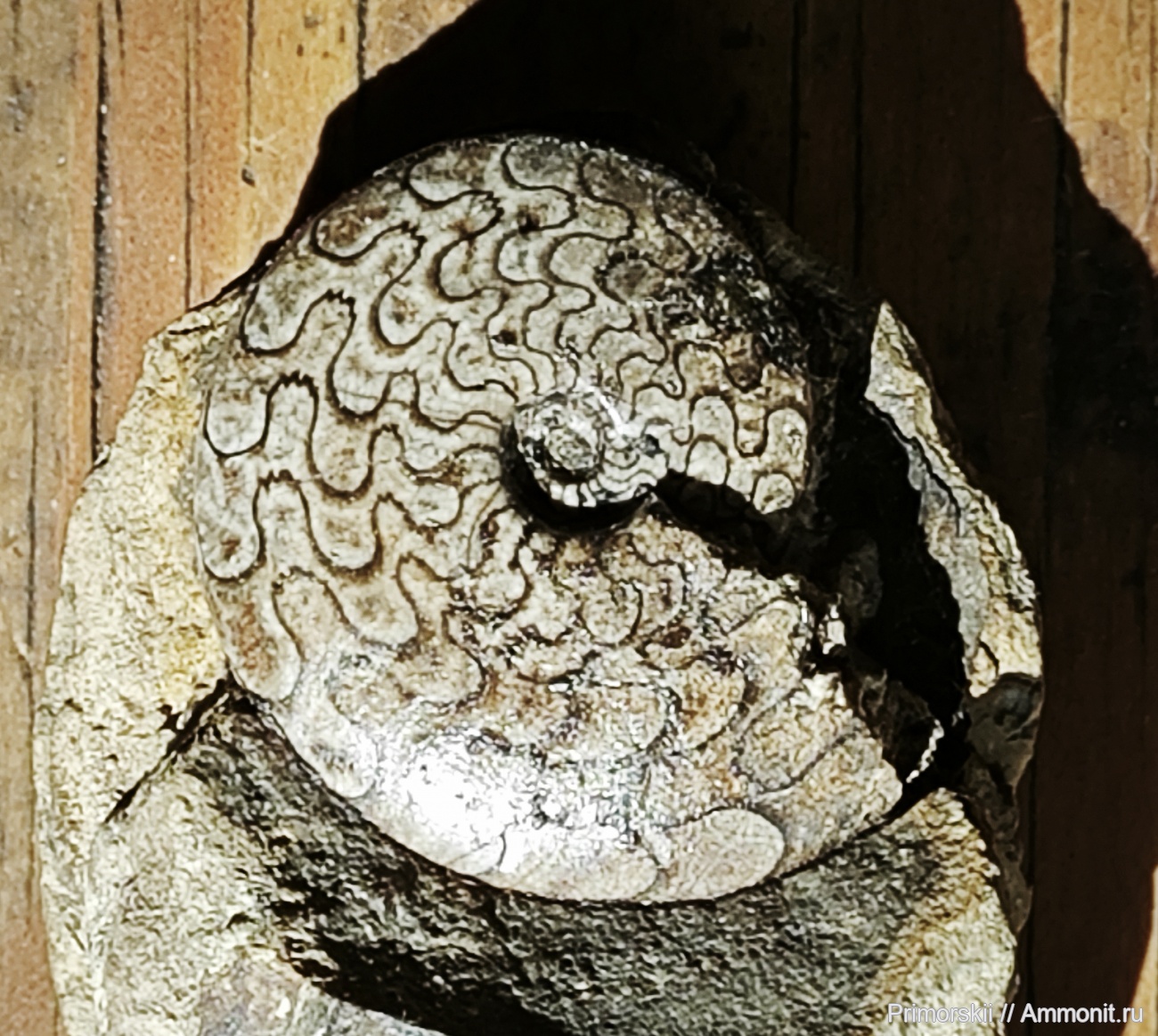 Фрагмокон Vercherites subcristatum Kiparisova, неполный на треть оборота, в конкреции .