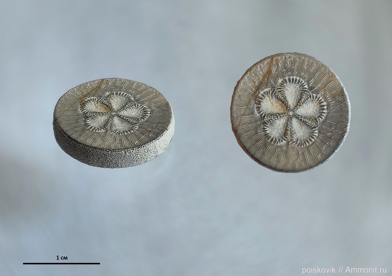 Членик стебля морской лилии Austinocrinus erckerti (в 2-х проекциях) из верхнемеловых пород Белогорского района Крыма (см. Верхнемеловые окаменелости Белогорского района – 2 ).