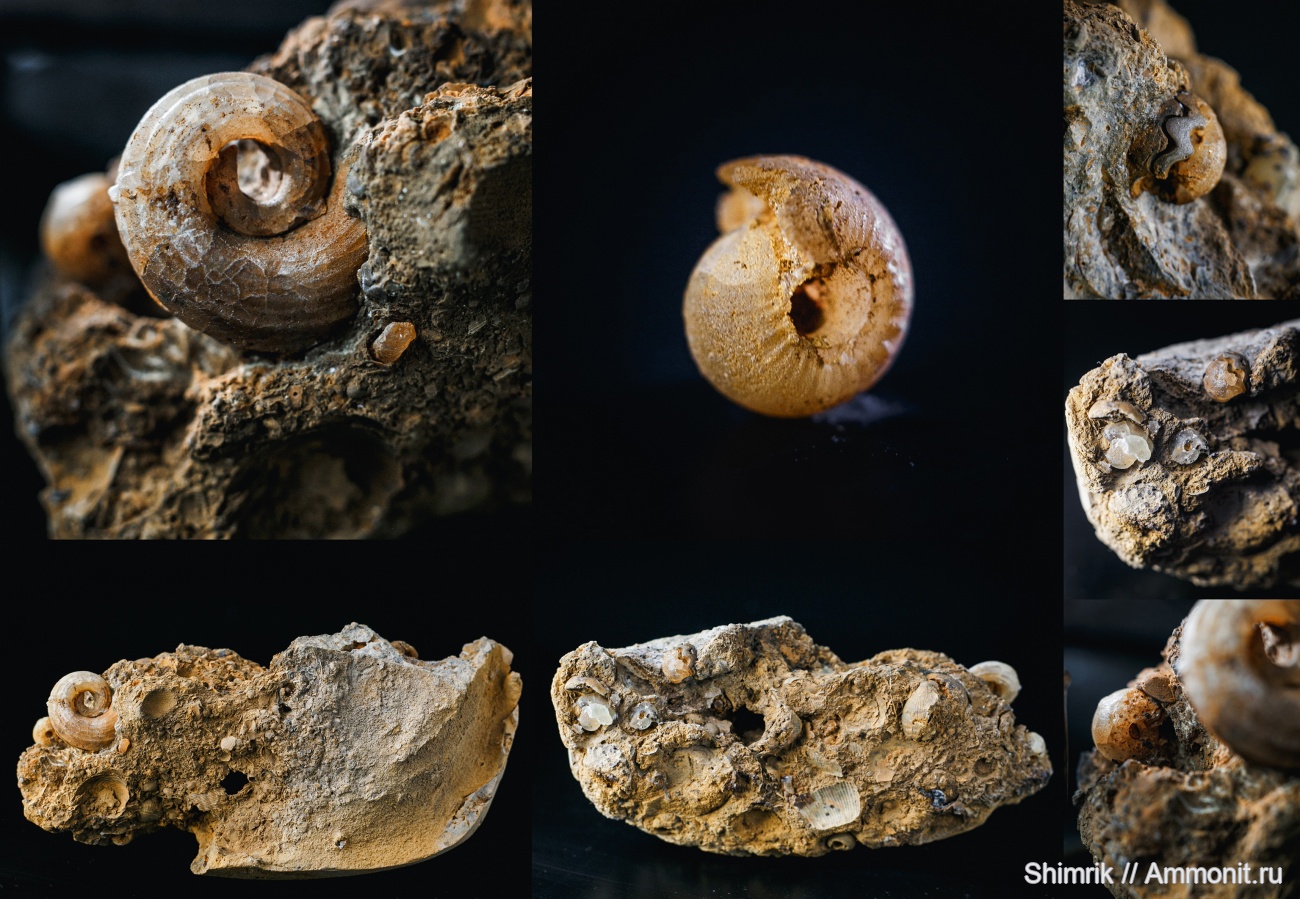 Вот здесь мы очень ждём помощи с определением аммонитов-колобочков. Один из них распадается на фрагменты и видна лопастная линия (фото справа сверху в коллаже).