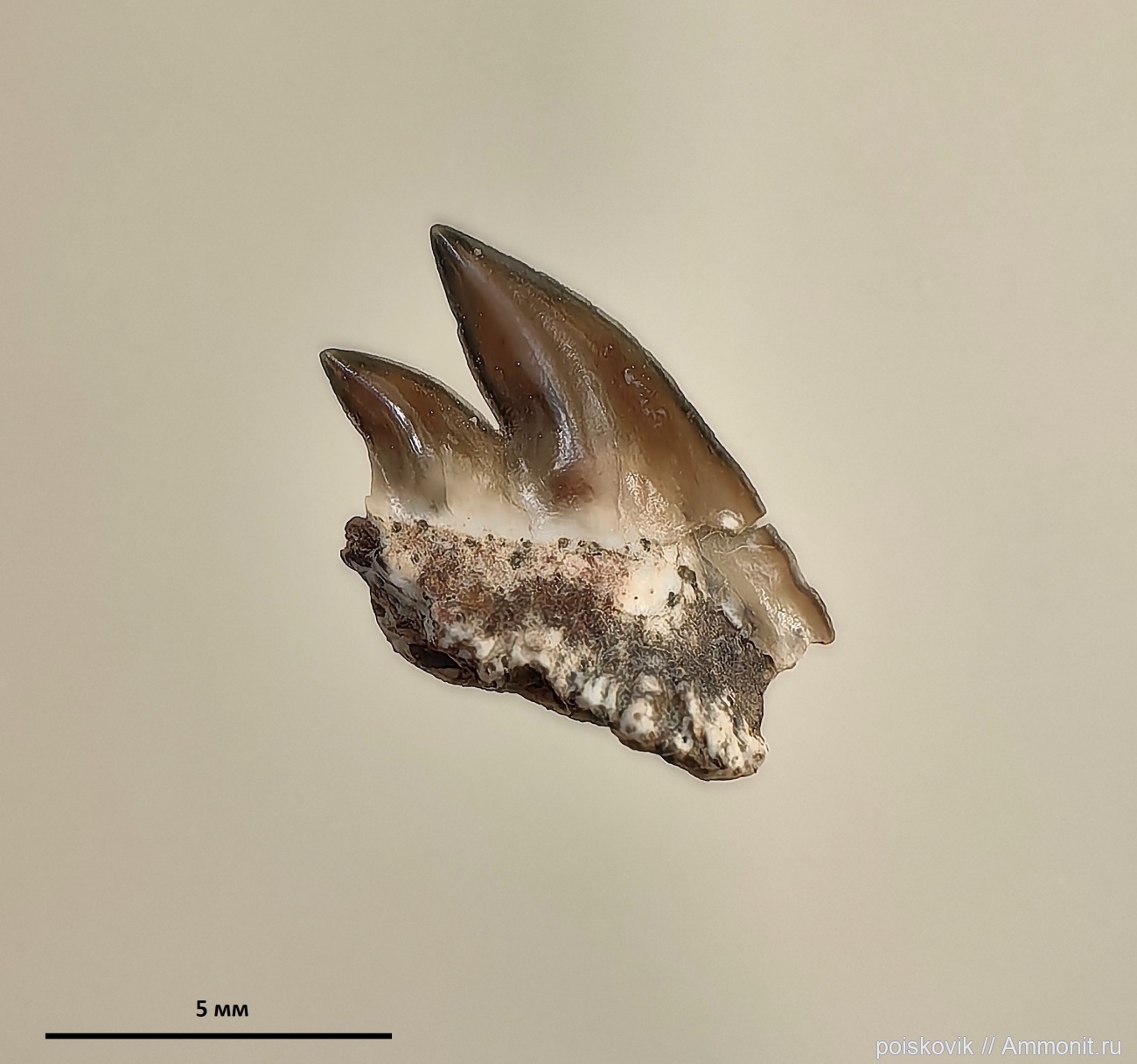 Зуб оксфордской (келловей - ?) гребнезубой акулы Notidanoides из обнажений южного склона хребта Кучук-Янышар. Дополнительное фото в 3-х проекциях см.Фото