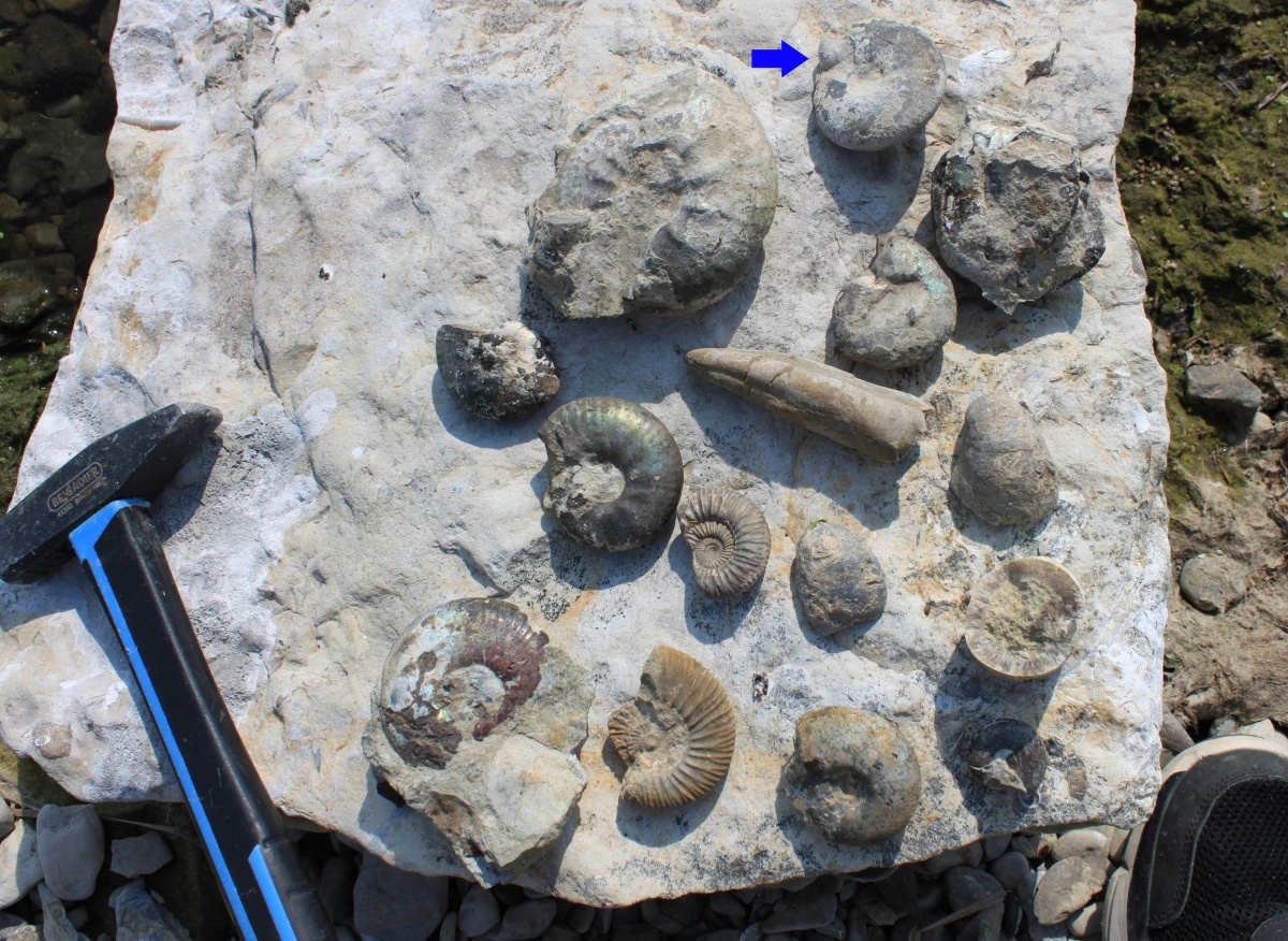 На дополнительном фото (по стрелке) - аммонит (противоположная сторона) сразу после поимки.