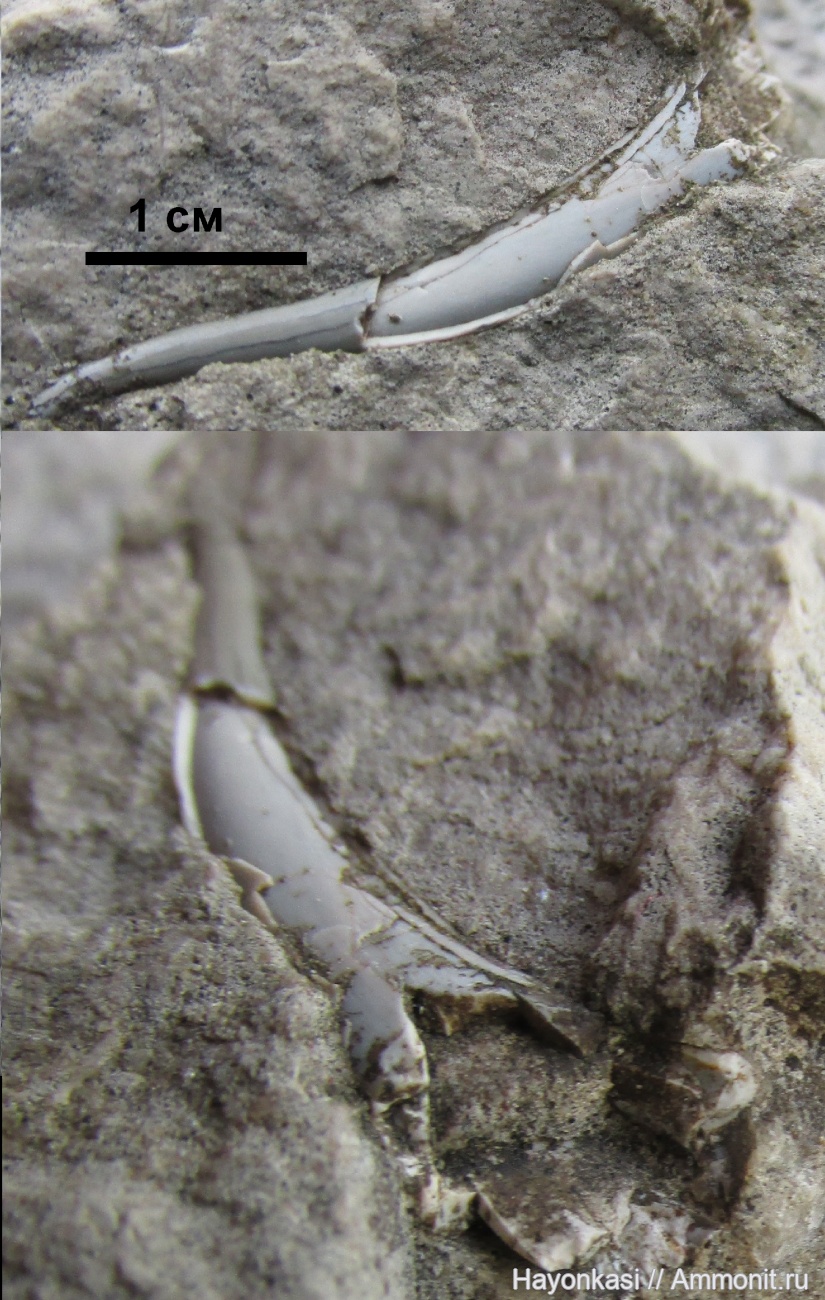Зуб лопастепёрой рыбы (предположительно Onychodus) в породе. Зубы (и другие останки) саркоптеригий на этой точке очень редки.