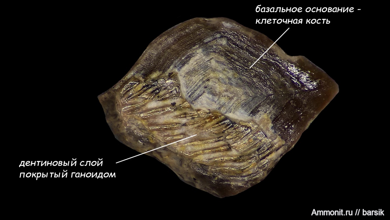 Попалась вот такая полуоблезлая чешуйка. Сначала не обратил на неё внимания, но потом подумал, что этот образец может наглядно показать строение ганоидной чешуи, которая характерна для акантодий и костных рыб класса Лучеперых, костных, а также многоперовых. Снизу как раз сохранился лицевой слой ганоина - специализированной гиперминерализованной ткани, по твёрдости уступающей только эмали. А верхняя часть чешуи на снимке - это открылось костное основание.
