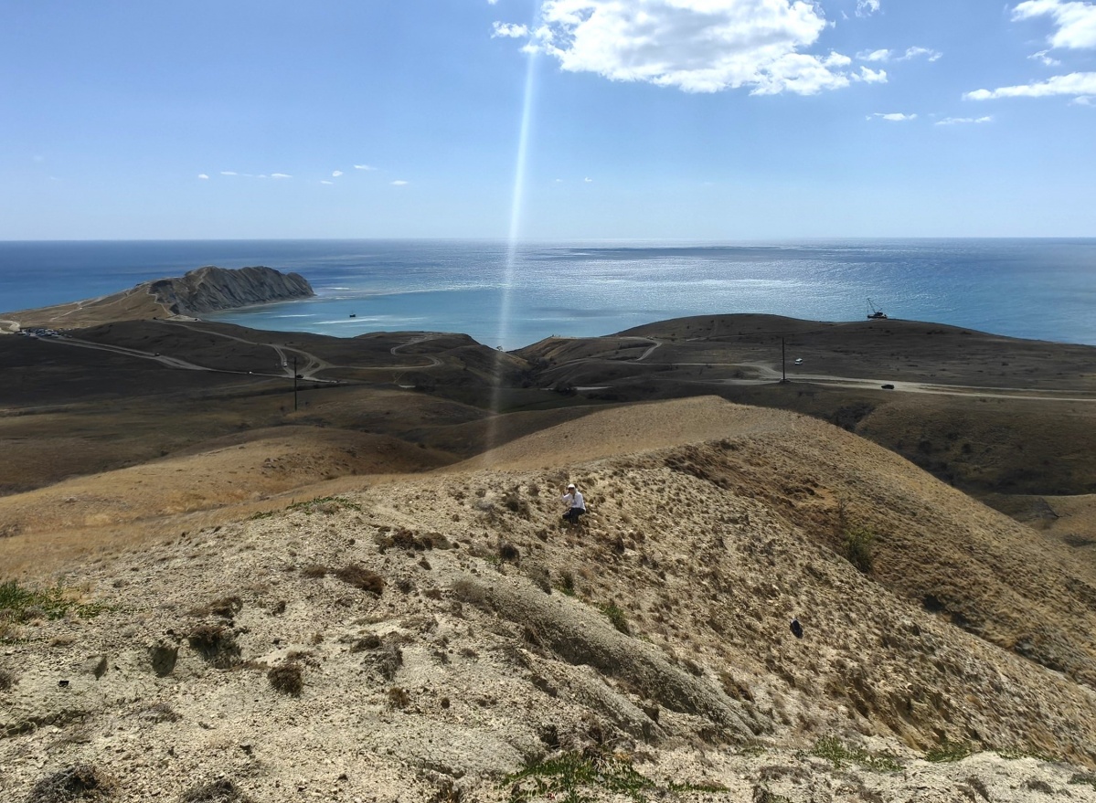 Аммонит диаметром 15 см из среднеюрских обнажений южного склона хребта Кучук-Янышар. Когда нашли аммонит, сделали фото. А теперь гадаем: то ли это солнечный блик на объективе, то ли «Перст Указующий» на место находки – см.Фото.