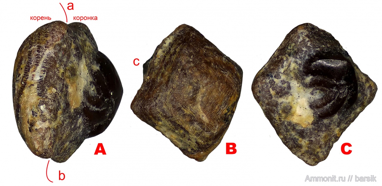 Проекция A - вид с боку и похоже, что эта чешуйка была глубоко погружена в тело рыбы по линии a-b.