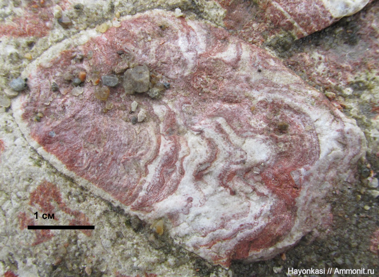 Полевое фото: продольный скол девонской губки Stromatoporoidea в "красной плите" на дне известнякового карьера. Колония в какой-то момент "отращивала вторую голову", но одна её часть почему-то прекратила рост. Перед захоронением её сбило с субстрата и сильно окатало.