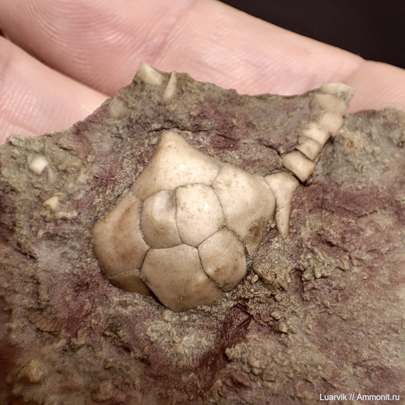 "Полевое фото" аберрантного экземпляра с нарушенным строением базального венчика. Взрослые гоплокринусы часто переходили к свободнолежащему образу жизни, теряя стебель - часто, но не все: в одном слое могут встречаться экземпляры как со стеблем, так и без. Но такое вот нарушенное строение базы для них нехарактерно, это первый подобный встреченный экземпляр. Сравнить его можно разве что с диплопоритой Protocrinites fragum, сильно перестроившей свою теку в результате адаптации к свободнолежащему образу жизни и имеющей чаще всего сместившиеся таблички основания с утерей стеблевой фасетки - но, в отличие от криноидей, диплопоритам вообще не свойственна регулярность взаимного расположения табличек теки.