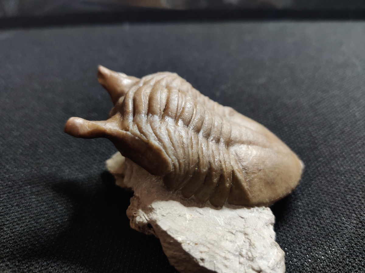 Второй раз повезло во время препарации, трилобит просто каким то чудом уместился в этом крохотном кусочке породы и не был сломан. Правый край хвоста по краю естественного излома, голова загнута вниз и уперлась в границу плитки.