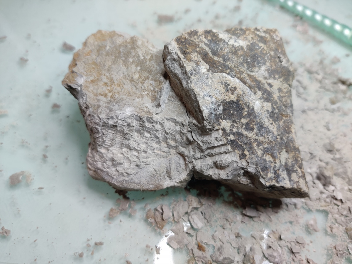 Это была маленькая плитка со дна речки, вся поросшая черной тиной. Почему я ее достал из многих других и расколол, не знаю, наверно чутье сработало. Раскол был невнятный на три части, но видно было что там что-то есть (поперечный скол и еще что-то). Три маленьких кубика умещались на ладони и после некоторых раздумий я все таки положил их в карман.