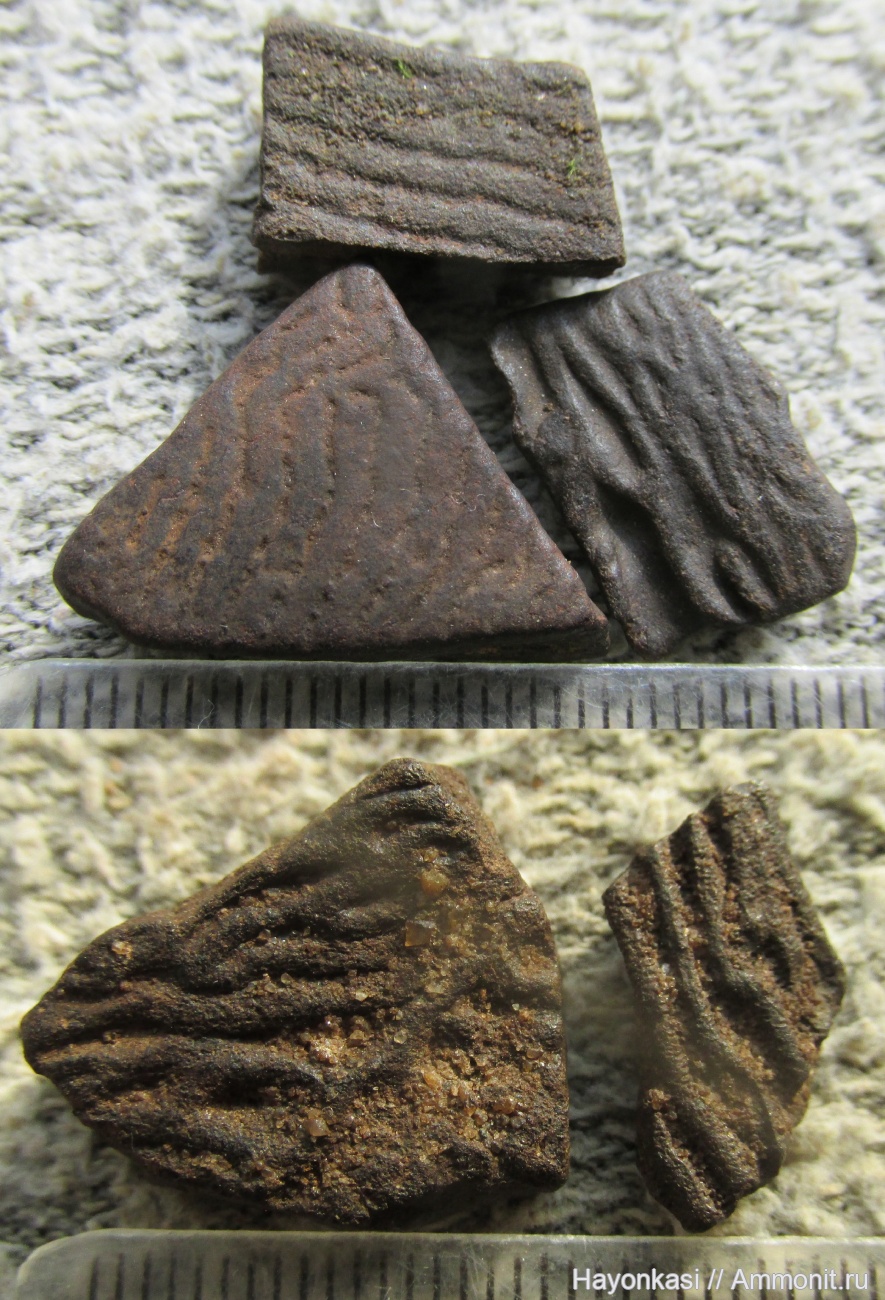 Фрагменты пластин плакодермы Holonema с полосатым орнаментом. На этой точке встречаются довольно редко.