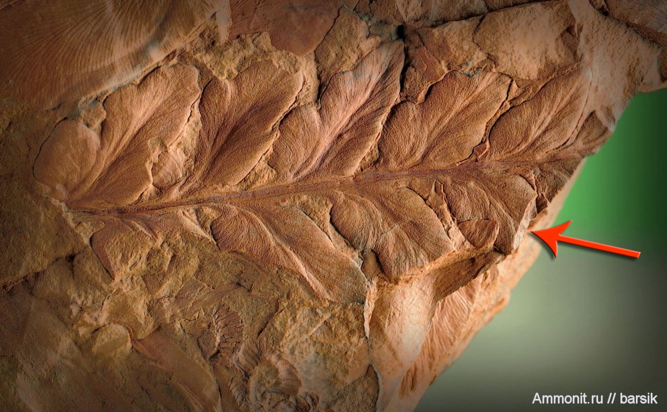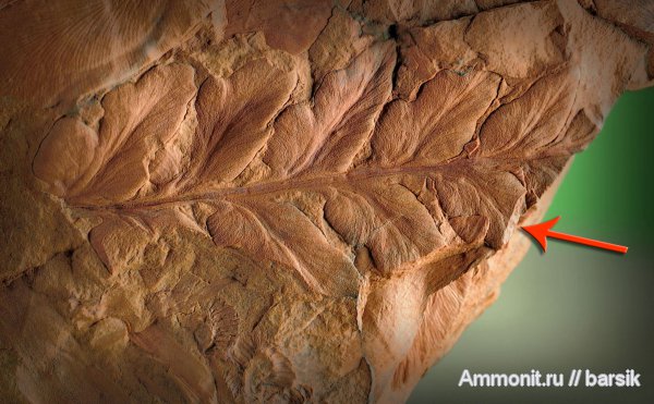 Небольшой лист - 3.5см. Интересно то, что сохранность объемная. По стрелке видно толщину листа на изломе. Т.е. получается, что лист окаменел в "сочном" состоянии.