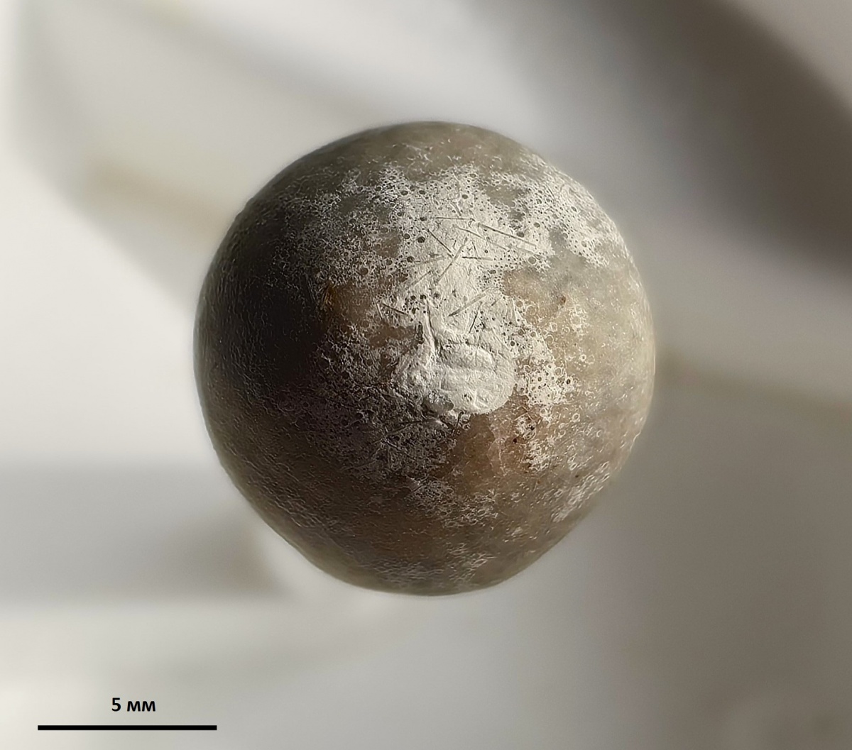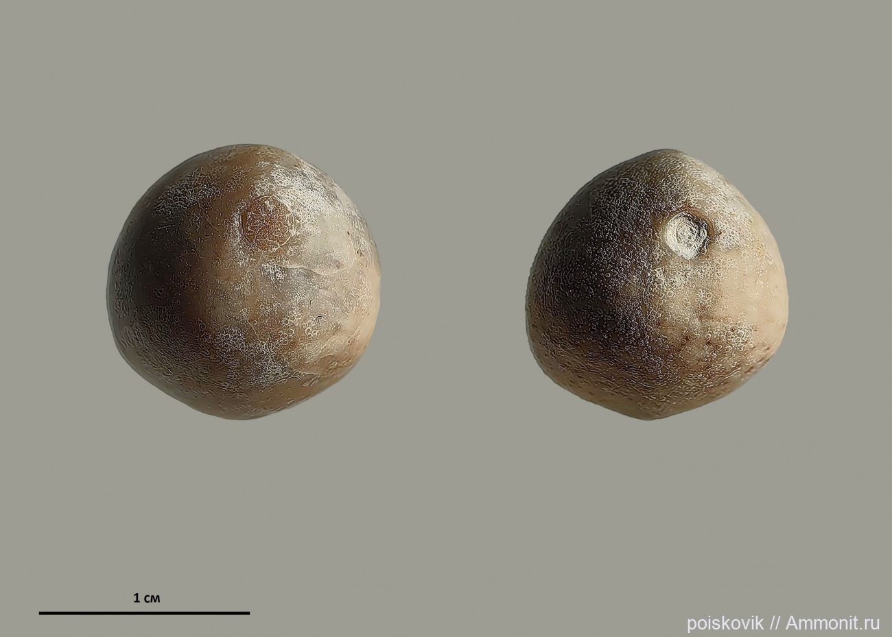 Нам повезло найти ежа Offaster с сохранившимися известковыми пластинками на анальном поле. Рядом, для сравнения - такой же Offaster с открытым отверстием.