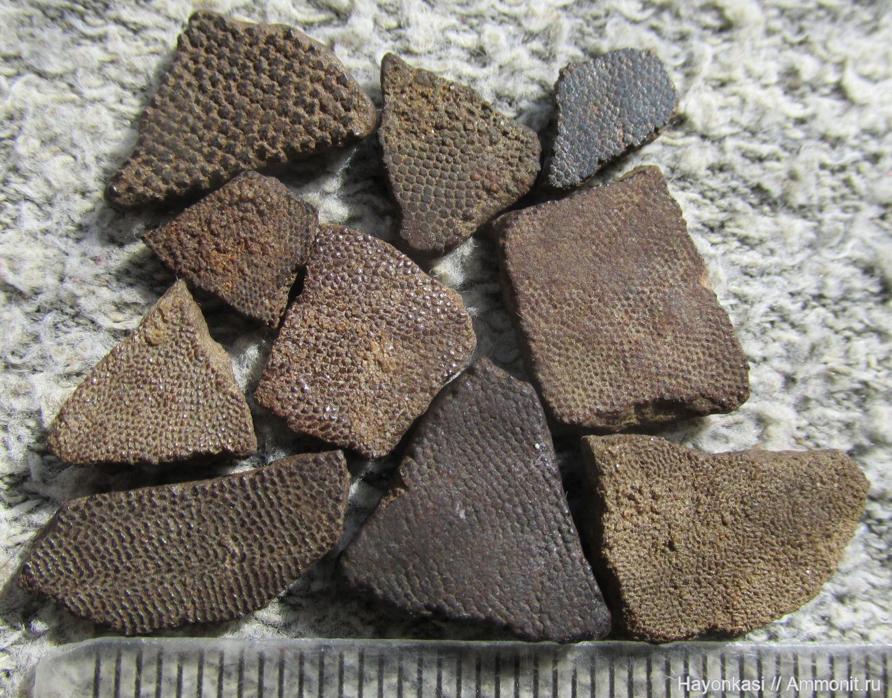 Фрагменты бранхиальных пластин бесчелюстных Pycnosteus sp. (с относительно крупным "звёздчатым" орнаментом) и Tartuosteus sp. (с более мелким "пиксельным" орнаментом).