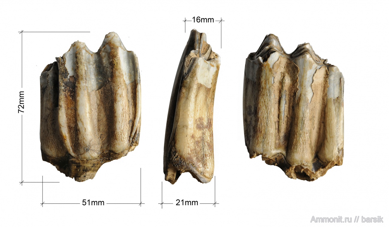 Зуб найден в намывных песках нижнее течение р. Дона. Образец достаточно крупный, побольше спичечного коробка. На палеофоруме определили как нижний задний коренной очень крупного быка. Не сильно знаком с разнообразием ископаемых быков, скорее всего, степной бизон.